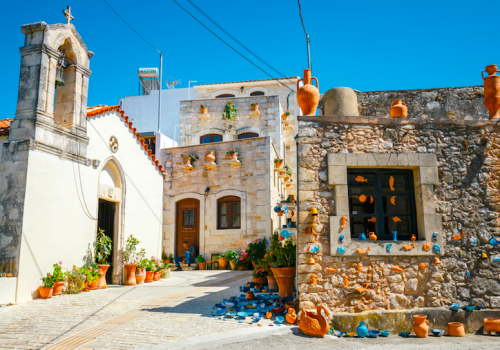 Margarites is a picturesque village located approximately 27 kilometers southeast of Rethymno in Crete, renowned for its rich pottery tradition that dates back to ancient times. Nestled amidst rolling green hills, the village is characterized by its narrow alleys, stone-built houses, and vibrant ceramic decorations adorning facades and courtyards. With over 15 ceramic workshops, visitors can observe artisans at work, creating unique pieces that reflect centuries-old techniques passed down through generations. Beyond its artistic heritage, Margarites offers historical intrigue with Byzantine churches featuring centuries-old frescoes and Venetian architectural elements. The village's serene atmosphere, coupled with its cultural significance, makes it a must-visit destination for those exploring the Rethymno region.